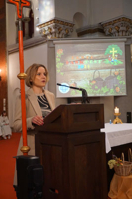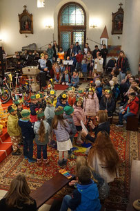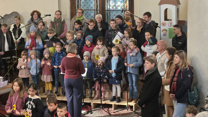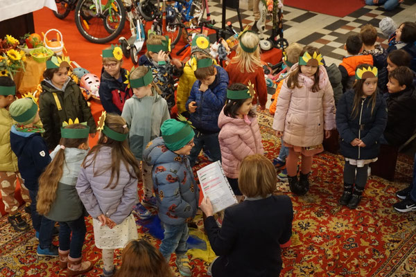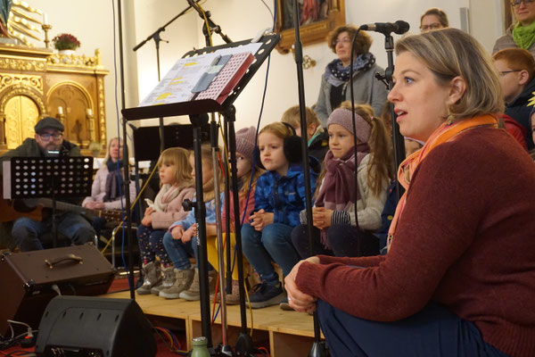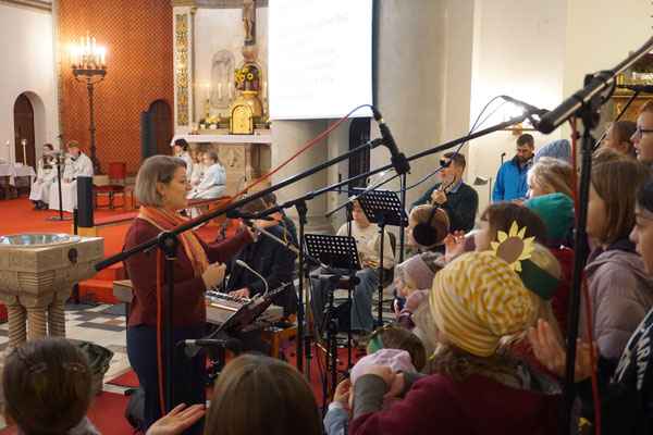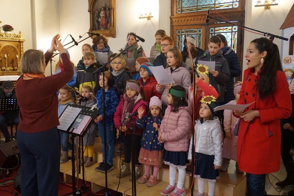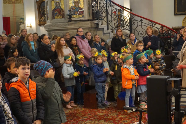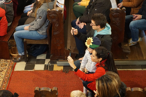 Während die immer größer werdenden Singvogelschar für eine angemessene musikalische Begleitung sorgt, bei der alle Kinder fleißig und begeistert mitmachen, lernt die Gemeinde im Rahmen der Predigt von vielen Kindergartenkindern, was ein Sonnenblumensamen so alles benötigt, damit aus ihm eine so schön anzuschauende Blume wird.