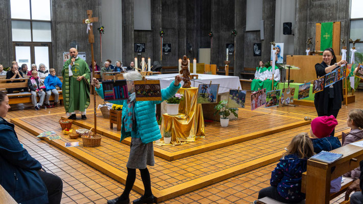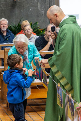 Pastoralassistentin Sonja trug dazu bei, die Predigt visuell zu untermauern und die Kinder aktiv einzubeziehen, um die zentrale Botschaft der Dankbarkeit für die gesamte Gemeinde erlebbar zu machen: Jedes Kind wurde eingeladen, nach vorne zu kommen, sich ein farbenfrohes Bild der Dankbarkeit auszusuchen und es mit einer kleinen Klammer an einer gespannten Schnur zu befestigen. Diese bunte Bilderreihe zog anschließend in einer kleinen Prozession durch die Kirche, sodass alle Anwesenden die visuellen Zeichen des Dankes bewundern konnten.