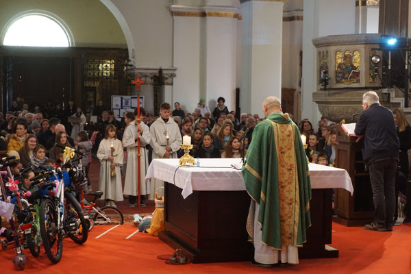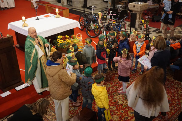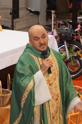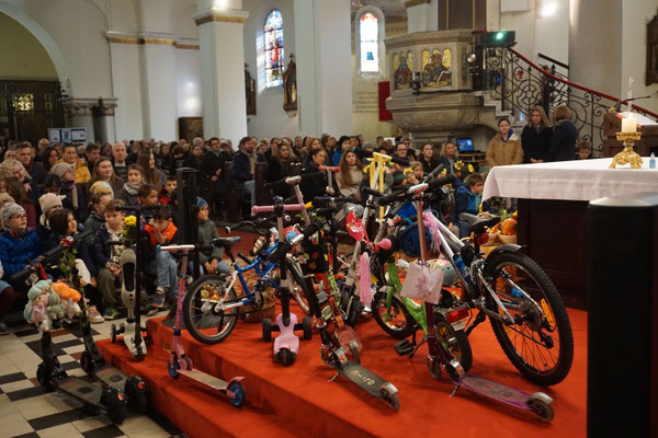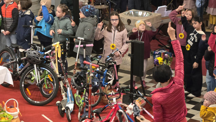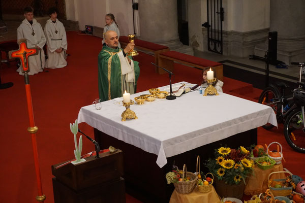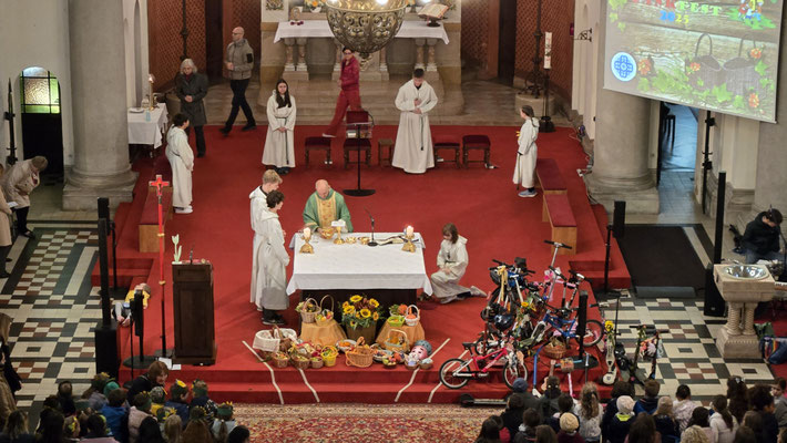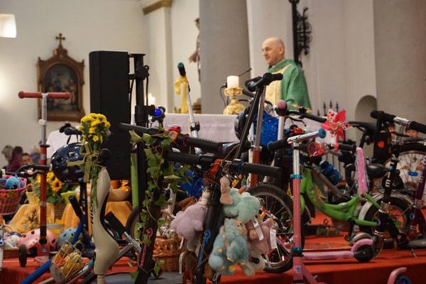 Mit dabei sind auch die vielen Kinder unseres Pfarrkindergartens begleitet von begeisterten Pädagoginnen. Die Kinder kommen mit ihren Rädern und Rollern, die feierlich geschmückt sind, andere bringen Körbe mit den Früchten unserer Erde mit. All das wird vor und rund um den Altar aufgebaut, um später von unserem Pfarrer ausgiebigst gesegnet zu werden.