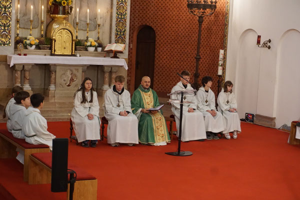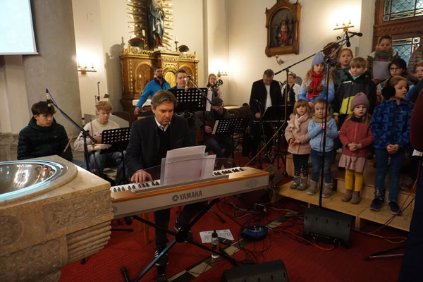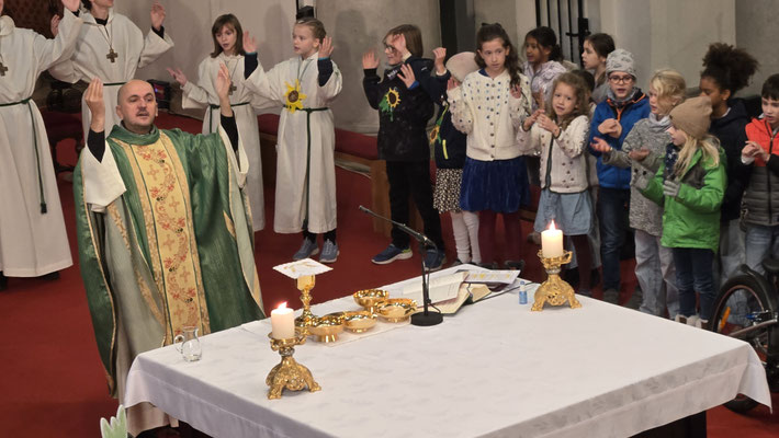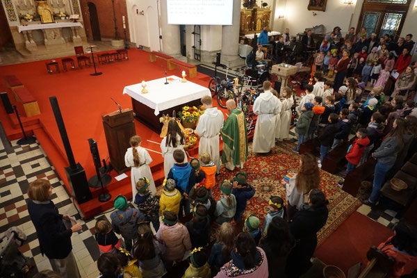 Beim Vater Unser ist der Altarraum fast schon überfüllt, so viele Kinder sind um Pfarrer Pawel Marniak versammelt.