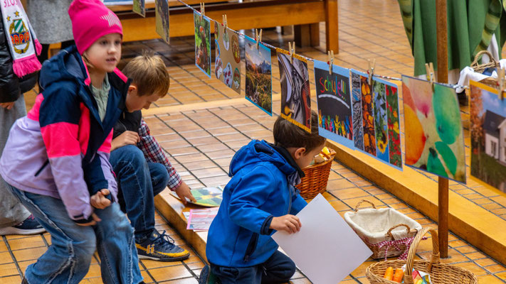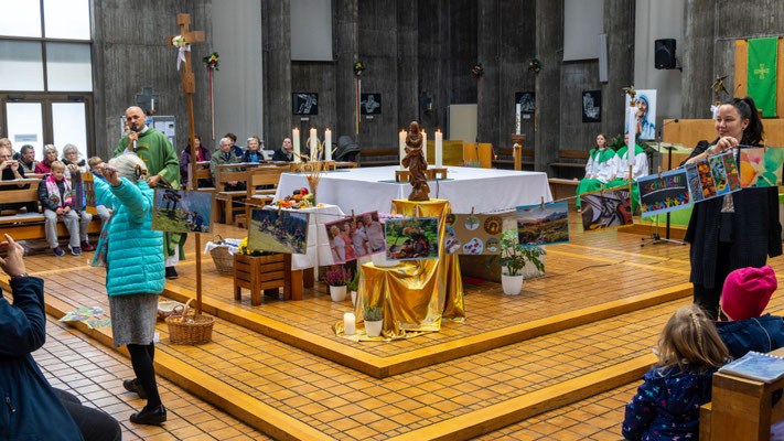 Im Anschluss daran fragte Pfarrer Pawel die Kinder, wofür sie ganz persönlich dankbar sind. Die Kinder teilten ihre Gedanken, während sie stolz auf das von ihnen gewählte Bild zeigten – ein bewegender Moment der Freude und des gemeinsamen Reflektierens.