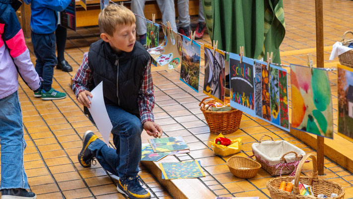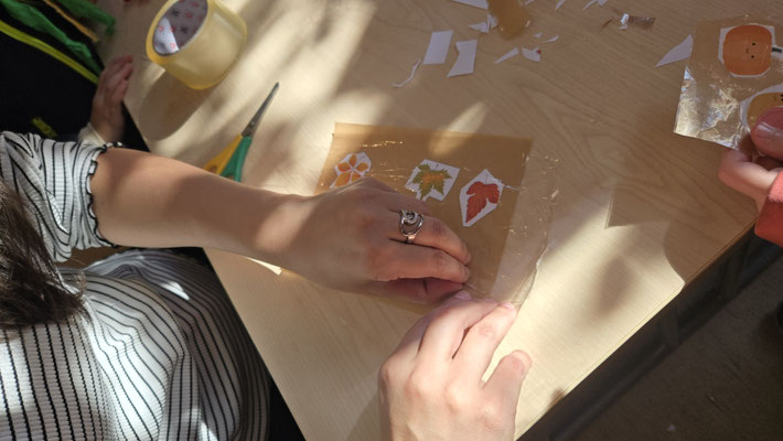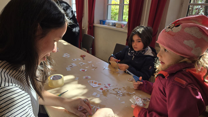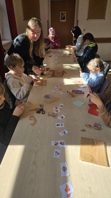 Aber einige Kinder haben noch nicht genug und basteln unter der fachkundigen Anleitung von Pastoralassistentin Sonja Reeh herbstliche Sticker mit Kürbissen, bunten Blättern, Eulen und anderen Motiven.