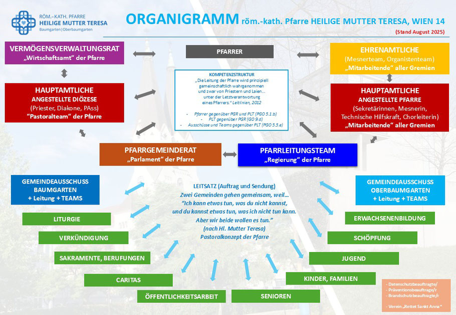 Es ist gar nicht so leicht, den Überblick über das große Angebot unserer Pfarre zu behalten. Im Organigramm der Pfarre Heilige Mutter Teresa haben wir versucht, alle Gruppen und Verantwortlichen grafisch darzustellen: